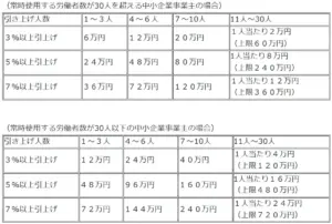 賃金額の引上げを成果目標に加えた場合の加算額は、指定した労働者の賃金引上げ数の合計に応じて、次の表のとおり、上記上限額に加算されます。なお、引き上げ人数は30人を上限となります。(賃上げ額そのものを助成するものではありません。)