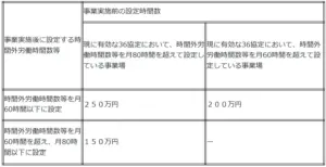 「時間外労働と休日労働の合計時間数を月60時間を超え月80時間以下に設定している指定対象事業場」の36協定について、2回目の取組によって月60時間以下に設定した場合は100万円。また、時間外労働と休日労働の合計時間数を令和6年度に設定した時間数よりも短くすることを目標として2回目の取組を行った場合で、令和6年度に設定した時間数と同数以下に設定した場合は25万円。