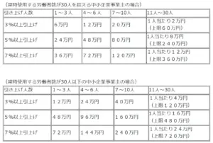 賃金額の引上げを成果目標に加えた場合の加算額は、指定した労働者の賃金引上げ数の合計に応じて、次の表のとおり、上記上限額に加算します。なお、引上げ人数は30人が上限となります。(賃上げ額そのものを助成するものではありません。)
