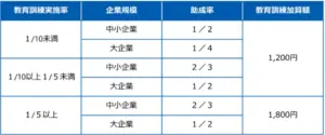 なお、支給日数(※1)と教育訓練実施率(※2)により、助成率と教育訓練加算額がそれぞれ以下が適用されます。(能登特例を利用する事業主には適用しません)。
