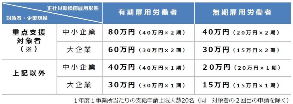 有期雇用 → 正社員: 80万円(重点支援対象者) ※2期に分けて申請する必要があります。